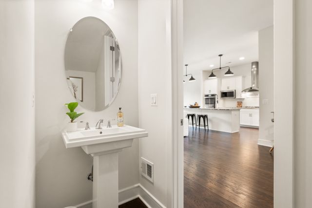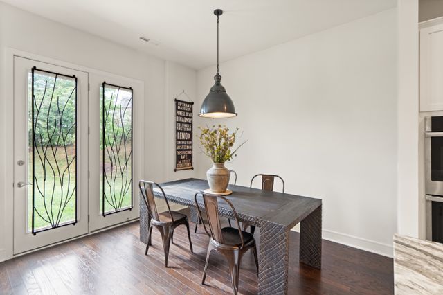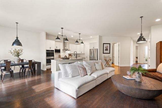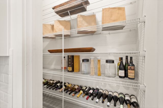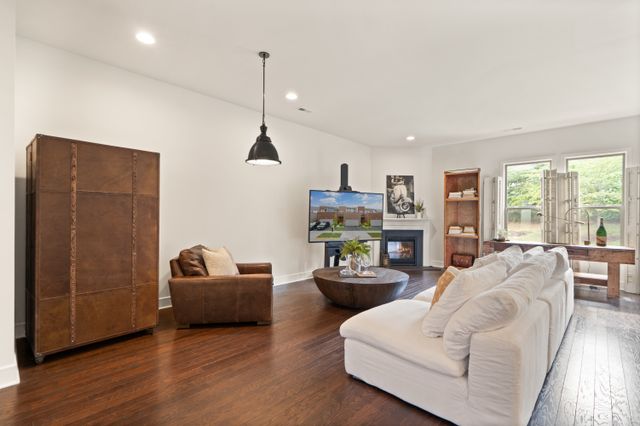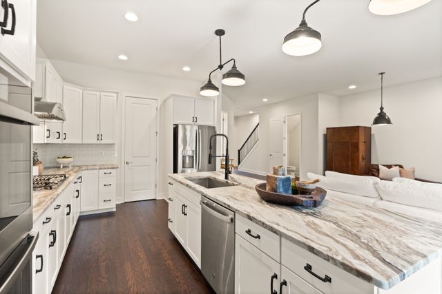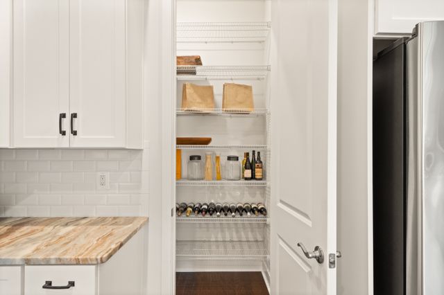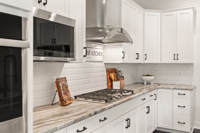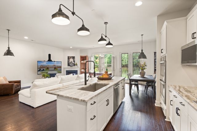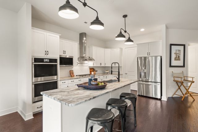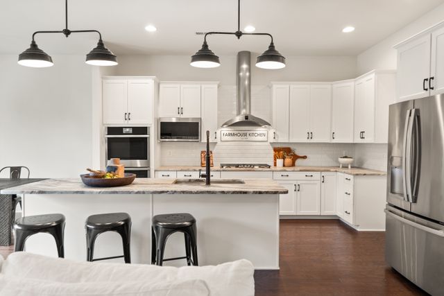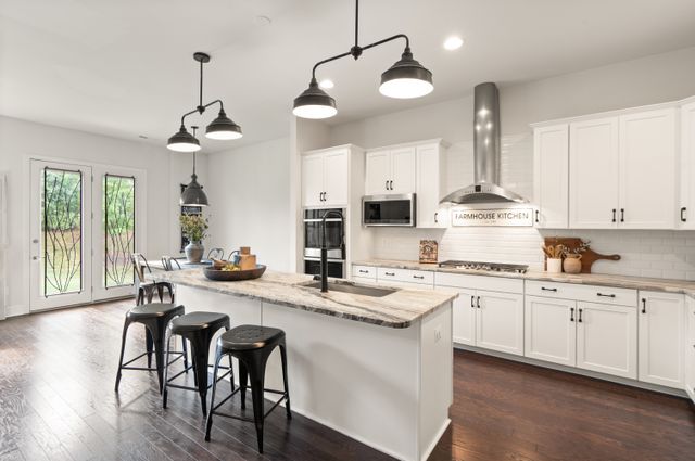 Inside, you immediately notice and feel the 3 1/2" thick chocolate hardwood floors that grace the main level, stairs and second-level hall. The open floor plan effortlessly flows from one space to the next, ideal for both relaxation and entertainment. The heart of the home, the gourmet kitchen, is a chef's dream with a stainless steel appliance suite- to include a gas cooktop with six burners, grill pan, a vented hood and upgraded smart double ovens that allow you to bake, roast, and broil while also having the option to cook with air frying. This stunning kitchen also offers you custom white tile backsplash, a Strive under mount single bowl sink, an upgraded Purist Professional matte black faucet, stylish Restoration Hardware pendant lighting and leathered granite countertops that cover a 9ft island and a 12ft back counter! Oh, and let's not forget the 10ft high walk in pantry that gives space for all of your bulk grocery shopping trips!